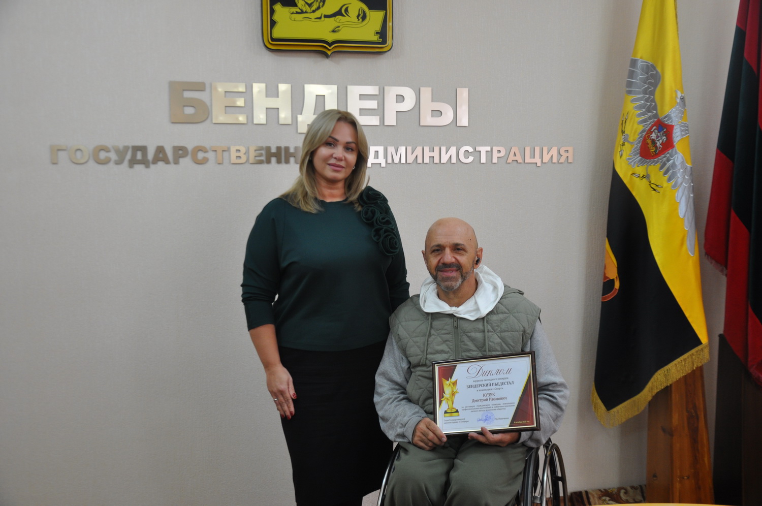 Лауреата муниципального конкурса «Бендерский пьедестал» Дмитрия Кузука чествовали позже в Государственной администрации. Замглавы по соцвопросам Оксана Котеля подчеркнула, что награда для бендерчанина – заслуженная, в этом вопросе сошлись мнениями все члены комиссии конкурса.