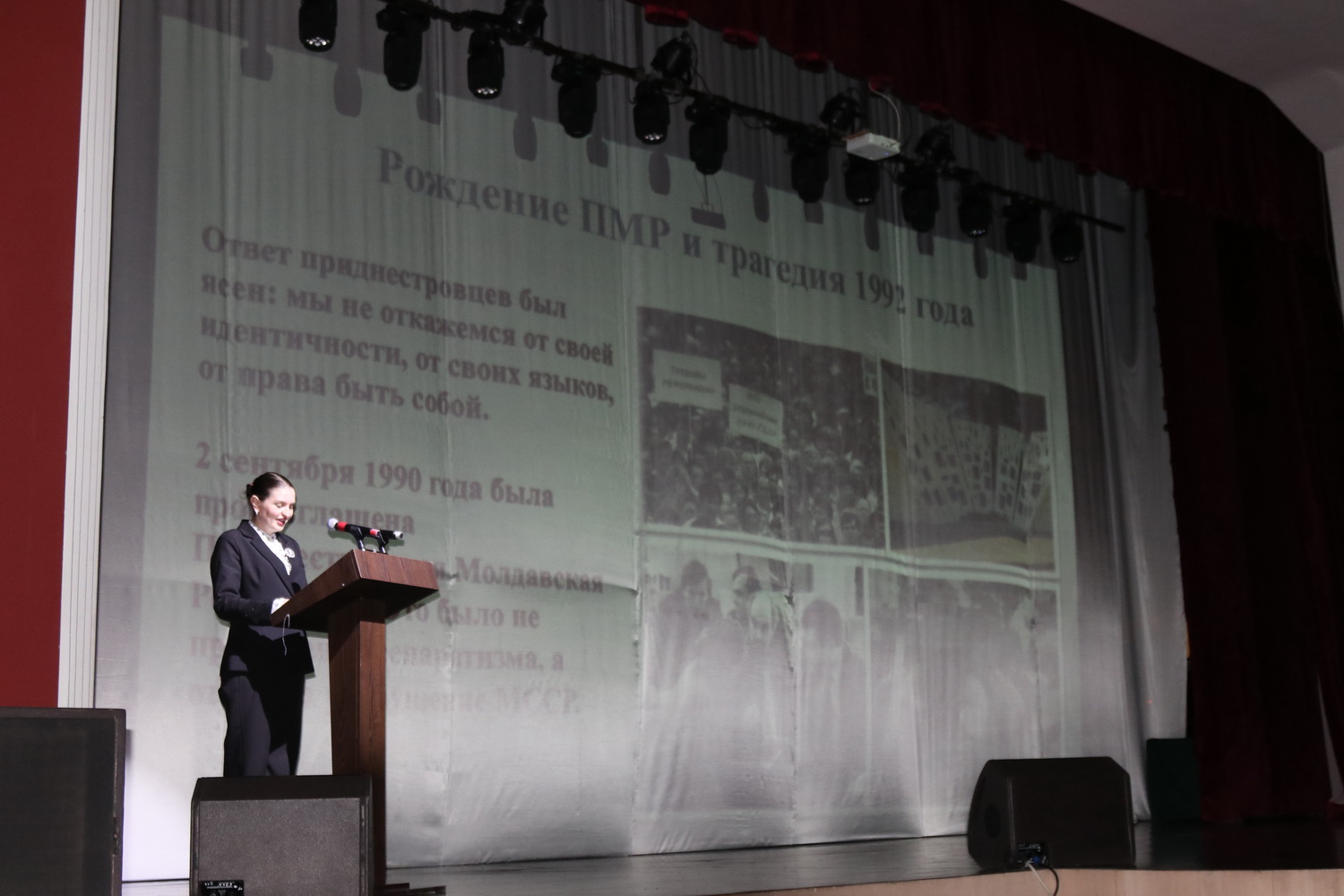 Лектор – молодой учитель Бендерской гимназии. Сегодня вместо школьников за партами – представители трудовых коллективов, педагоги, общественники. Главная мысль выступления: приднестровский народ — это не география, это история. Результат долгого и непростого синтеза культур, языков, судеб.